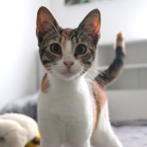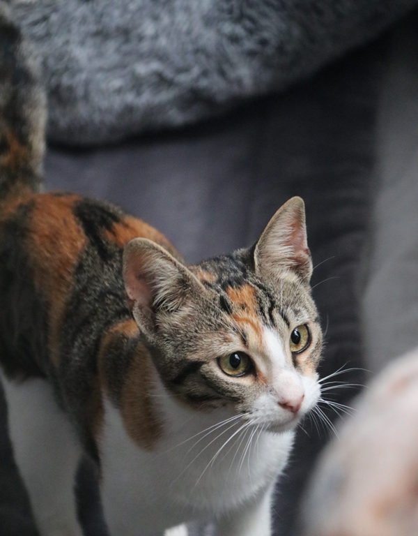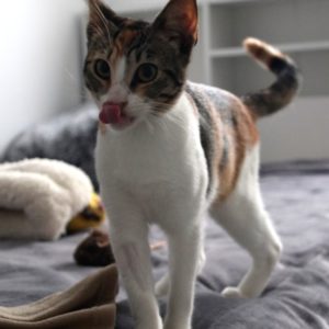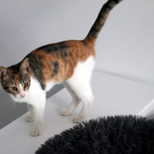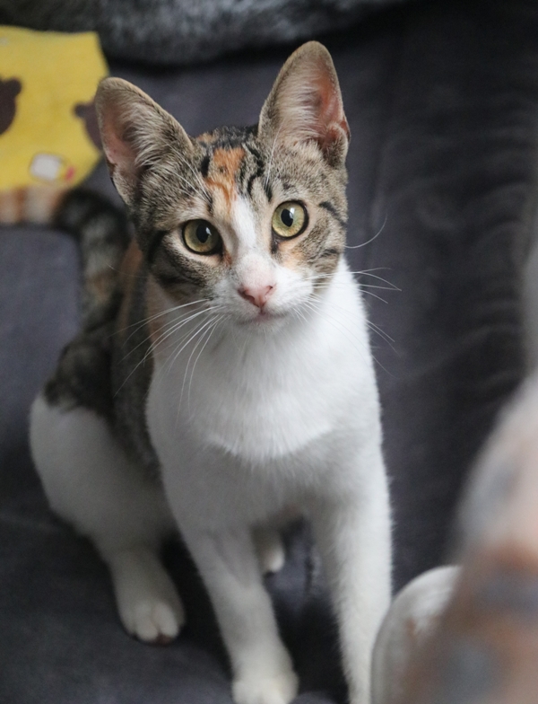Es una gatita mega cariñosa, te da topetes y te pone la barriguilla para que la toques. Muy juguetona, porque es muy jovencita. Nacida sobre el 19 de marzo de 2025. Ya la hemos esterilizado, ya que estaba en celo cuando entró en el veterinario.