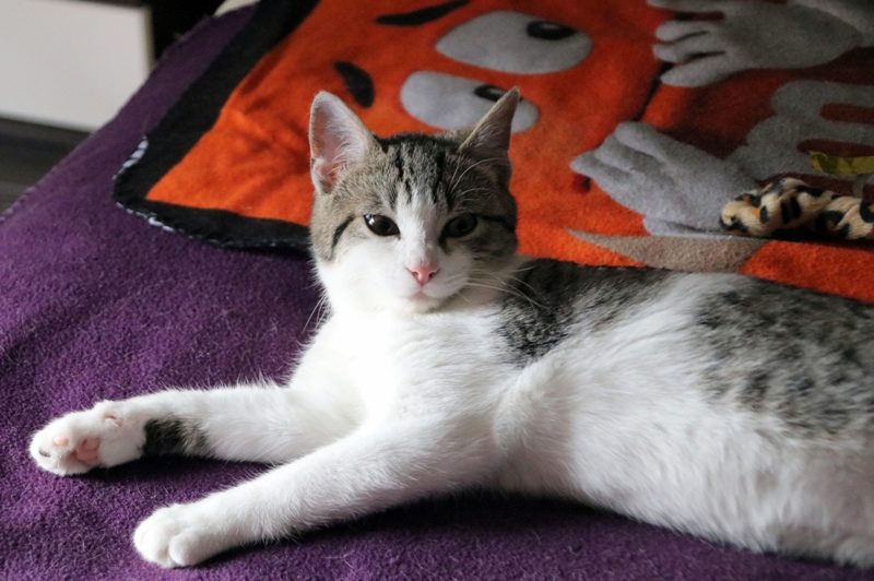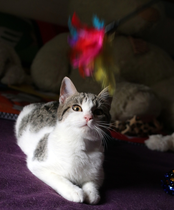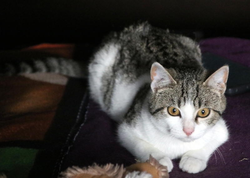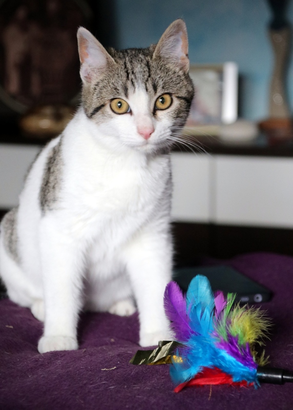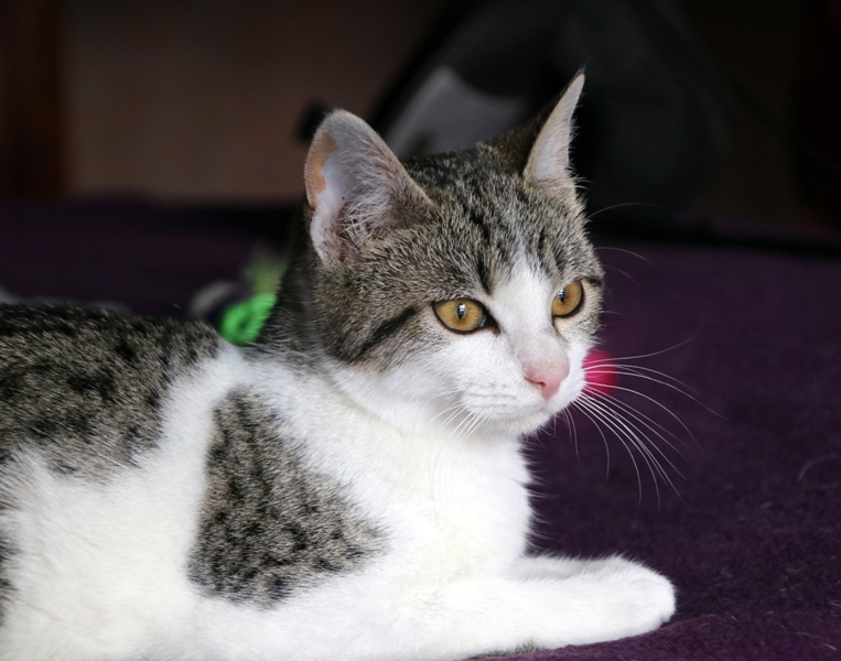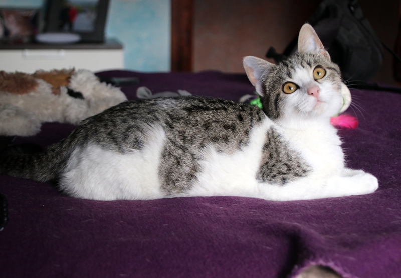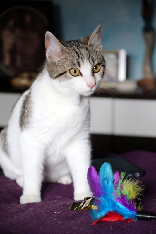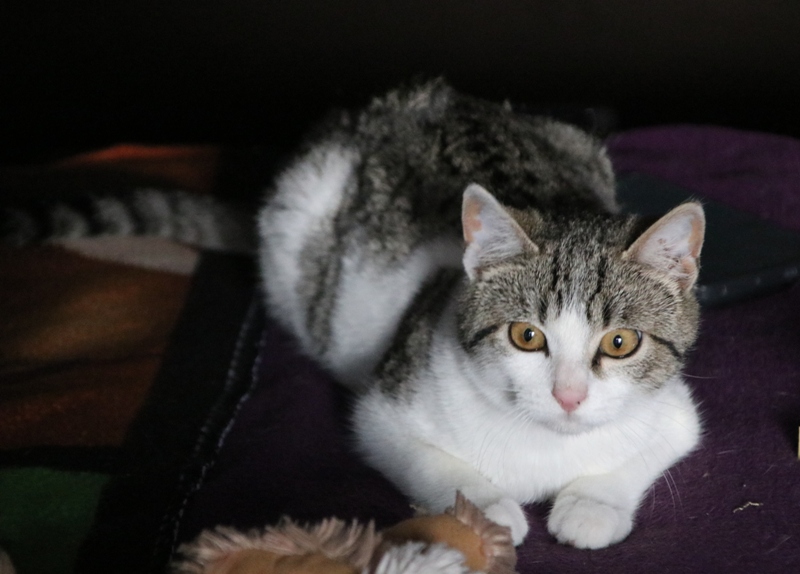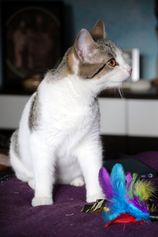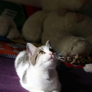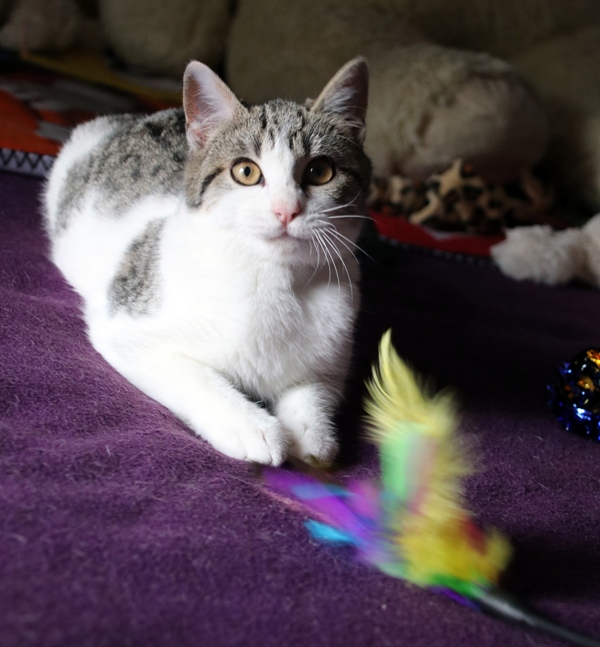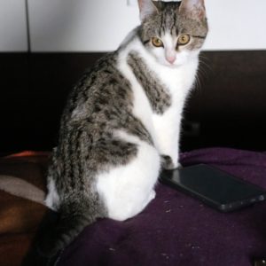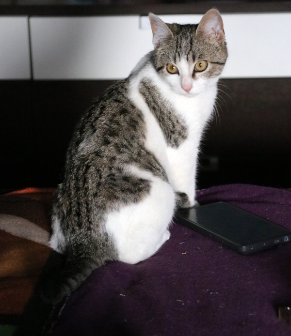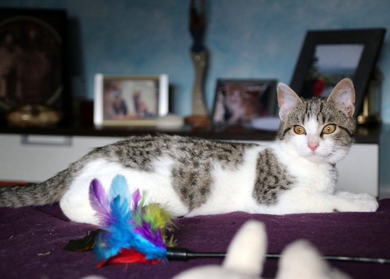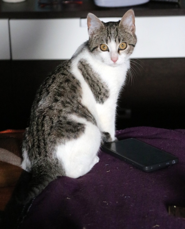 Es súper juguetona, cotilla, divertida, aprende de sus compis felinos todo lo que puede, y ronronea y amasa que da gusto…
