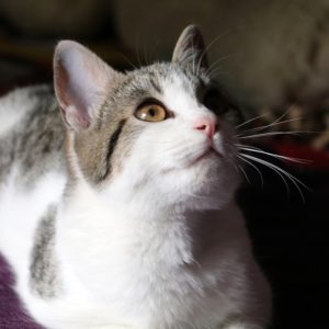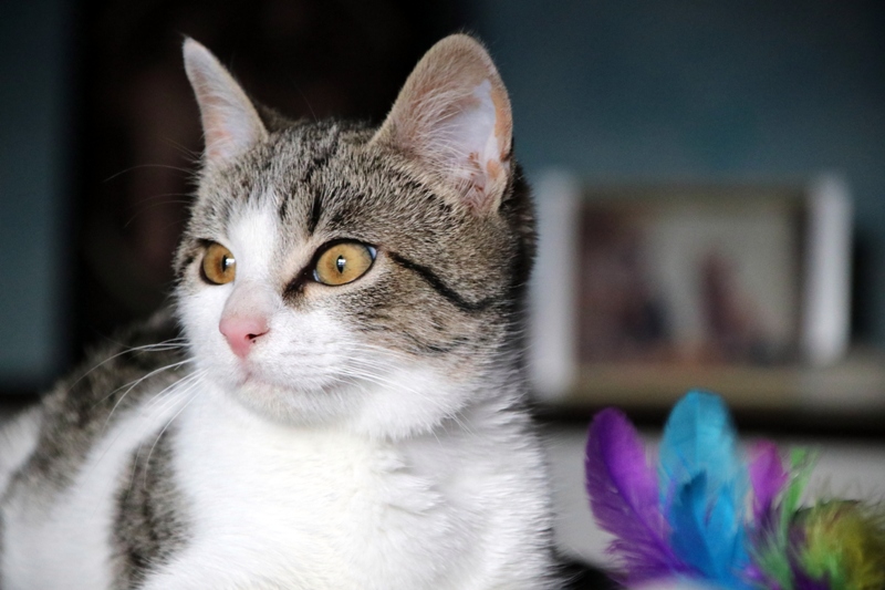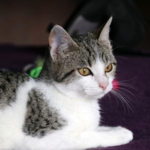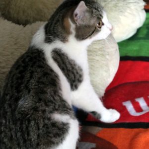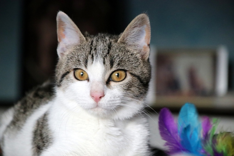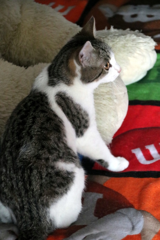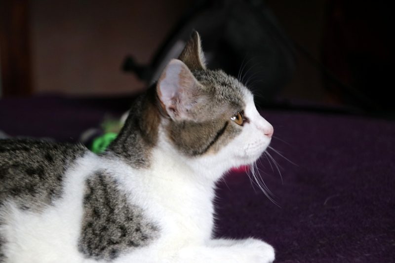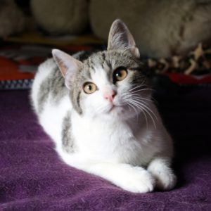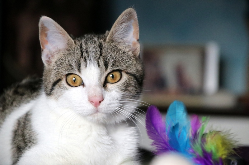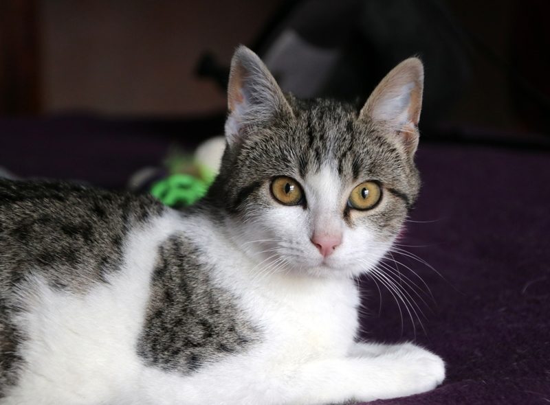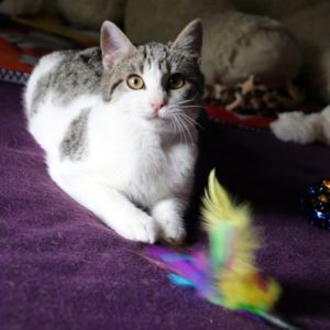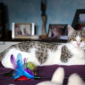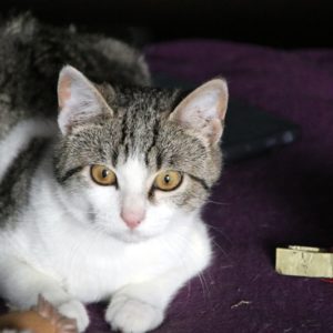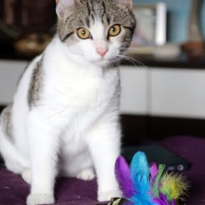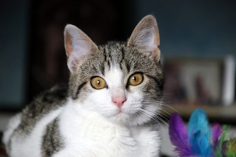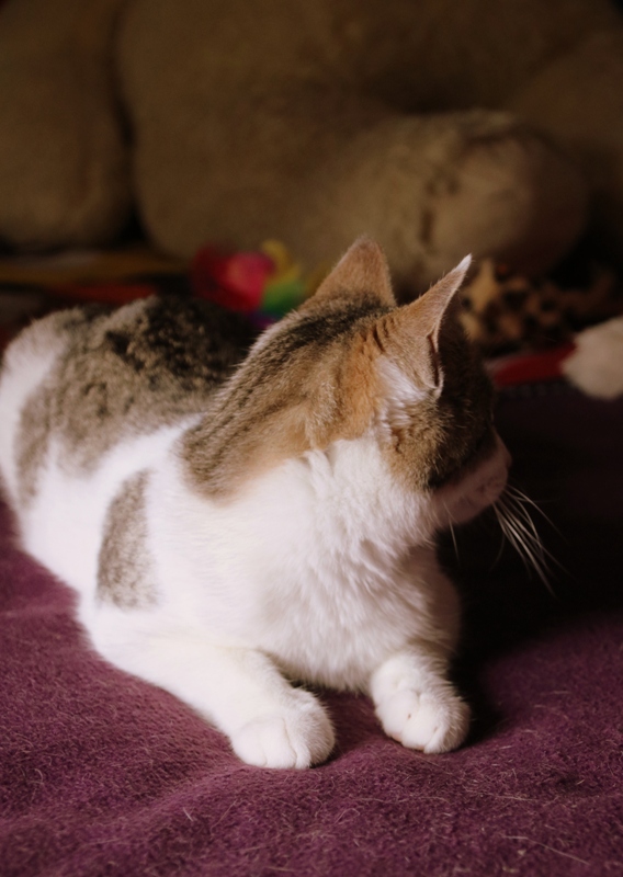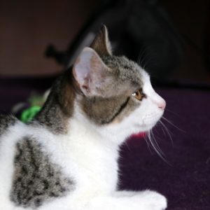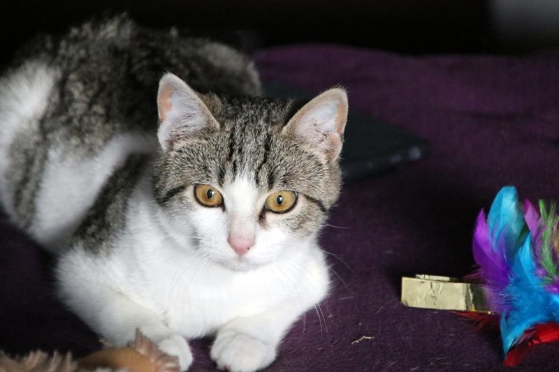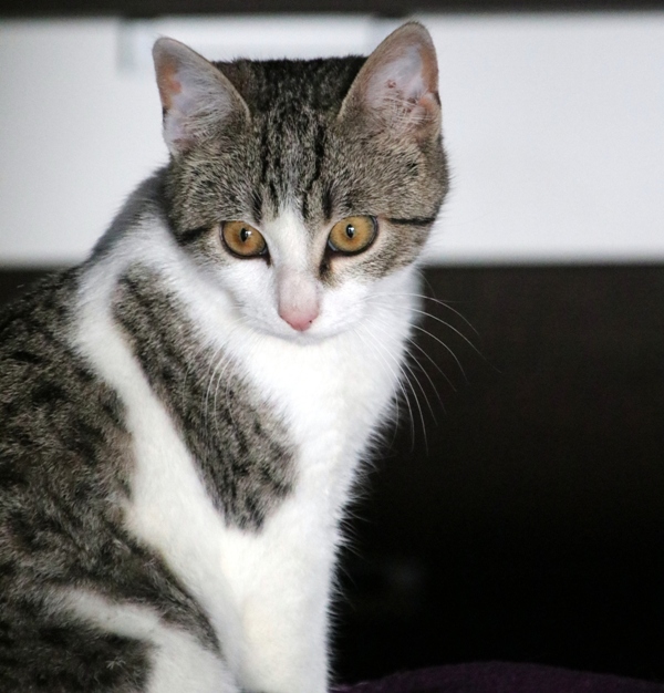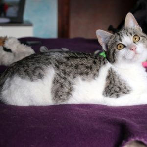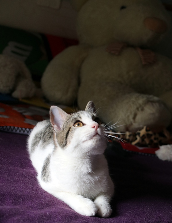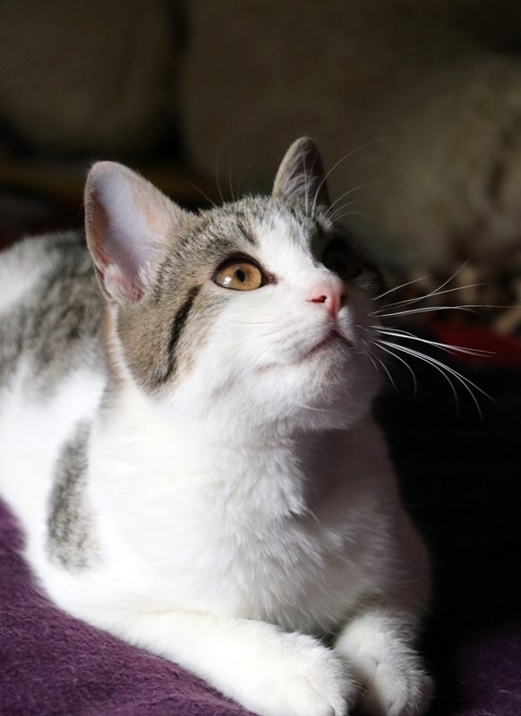 Es súper juguetona, cotilla, divertida, aprende de sus compis felinos todo lo que puede, y ronronea y amasa que da gusto…