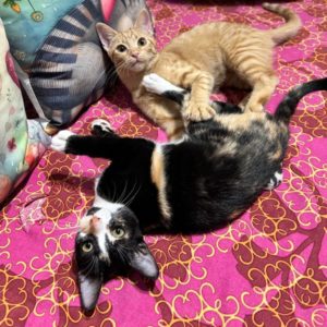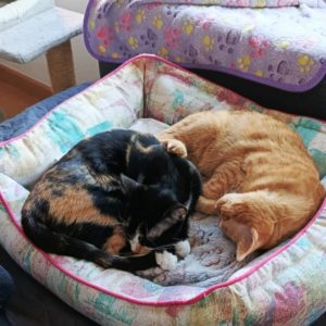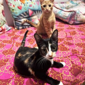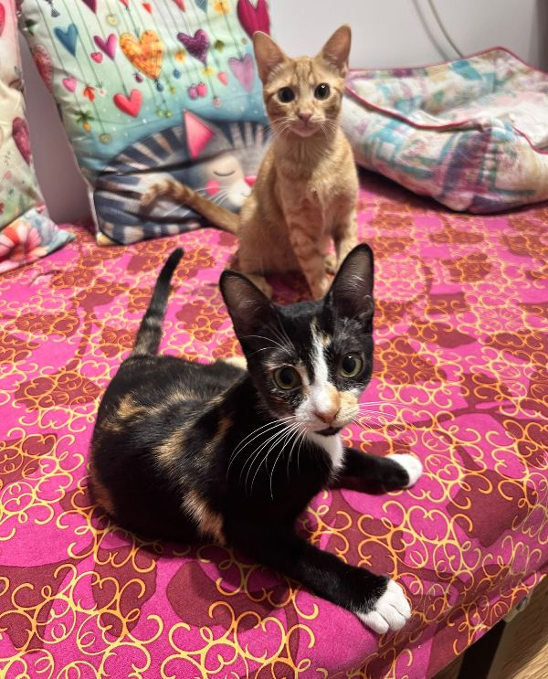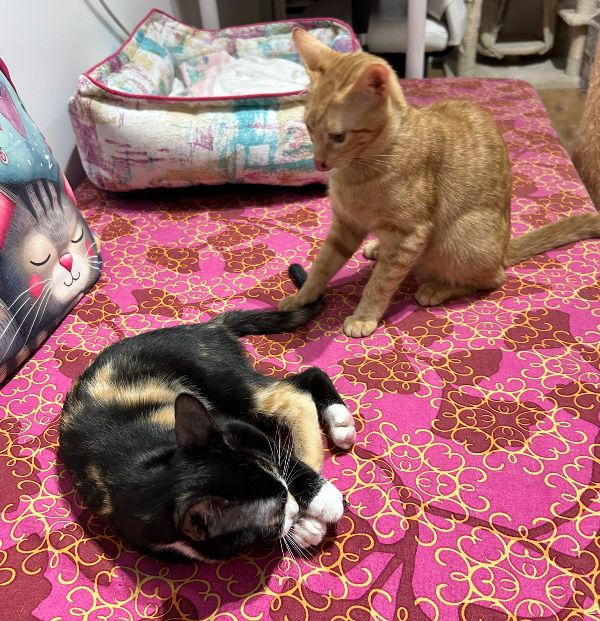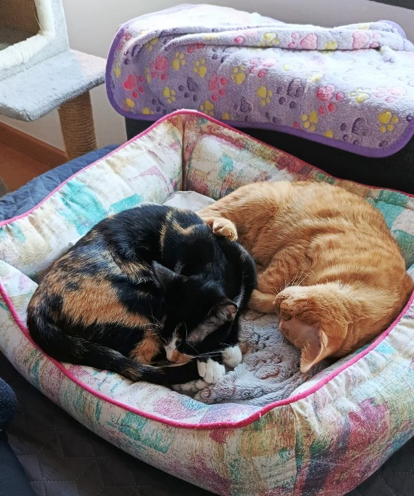 Son mimosonas, divertidas, muy buenas y alegres, y son muy dependientes las dos. Se buscan para dormir, para jugar, y se maúllan ni no se ven. Adorables.