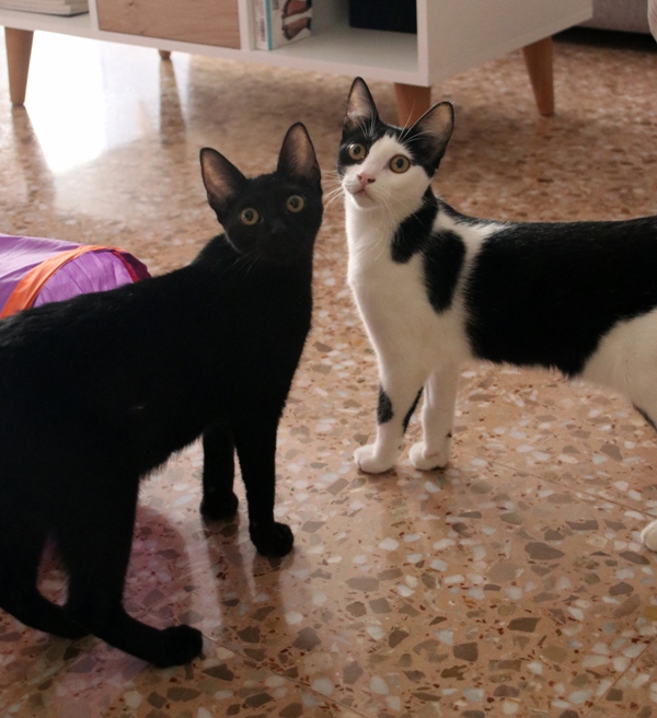 Este par de preciosidades espera en su familia de acogida a que aparezca la persona que vea más allá de sus colores, blanquinegro y negro, los menos adoptados, y se dé cuenta del fantástico par de gatas que son JULIE Y JUANOLA. Una parejita para llenar tu vida de alegría, ronroneos, risas y mimos.