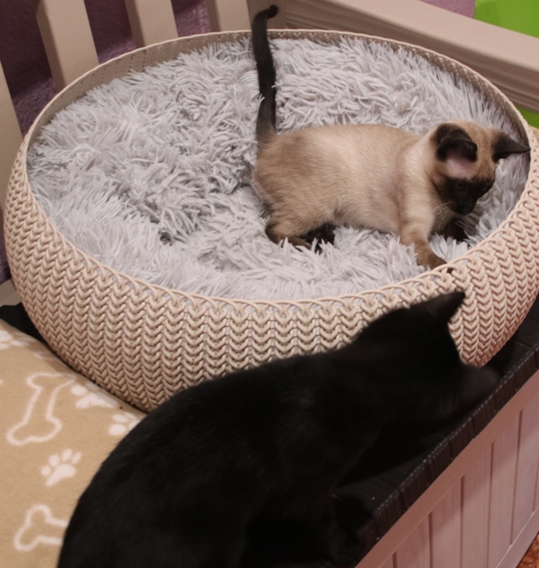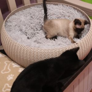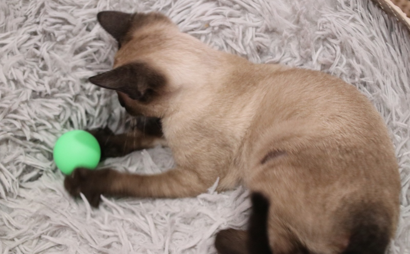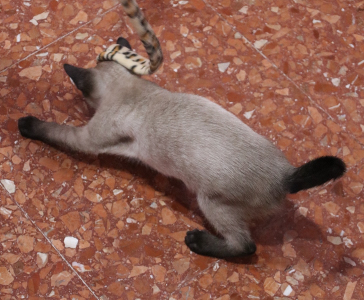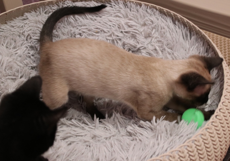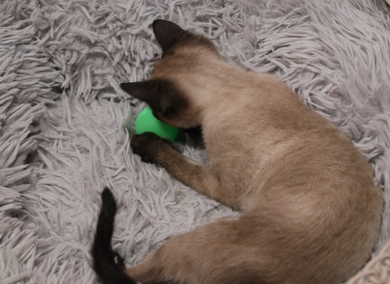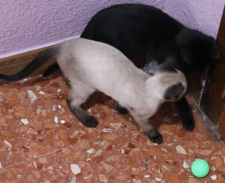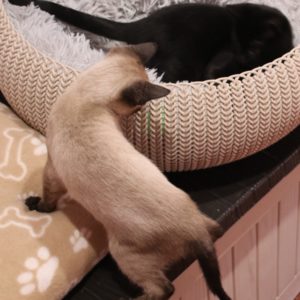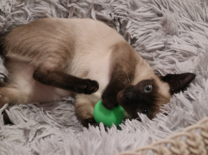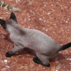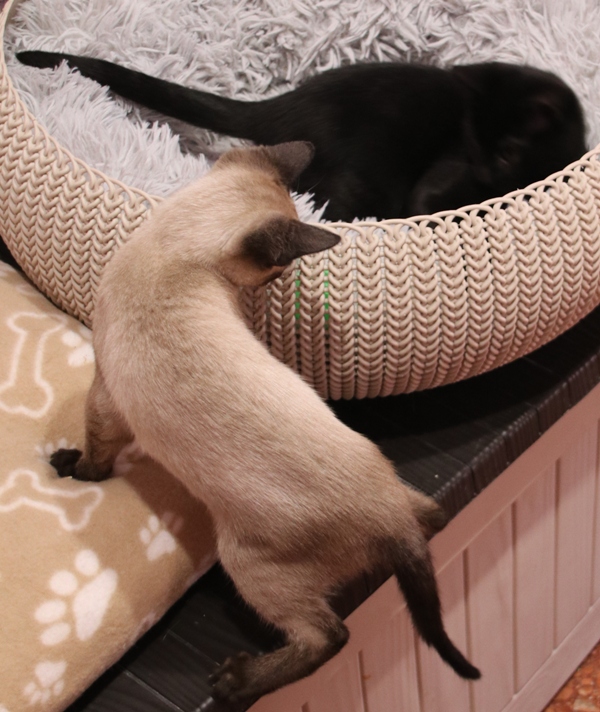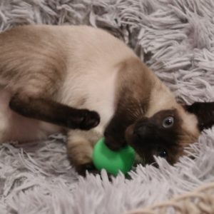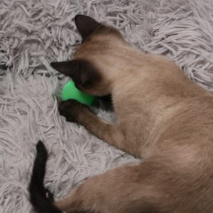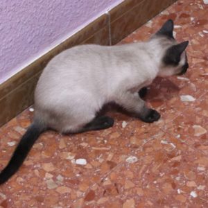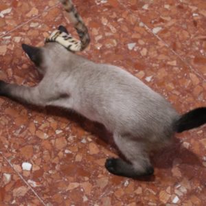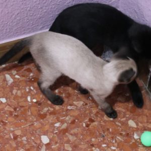 Es súper juguetona, como la mayoría de siameses inquieta, muy activa, cotilla, divertida, aprende de sus compis felinos todo lo que puede, y sólo para de jugar para dormir, jajajaja…..