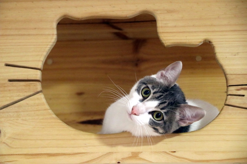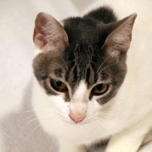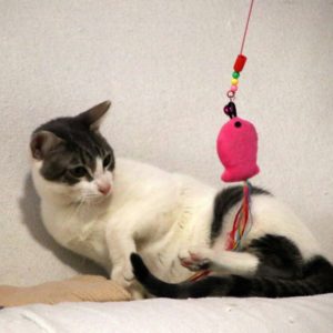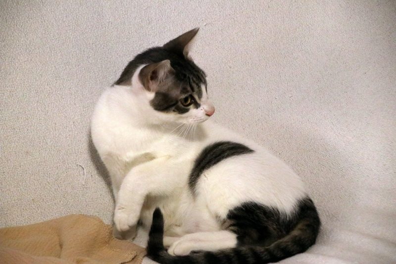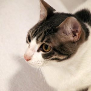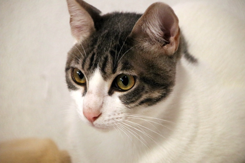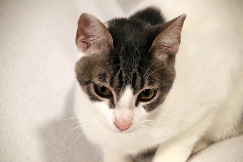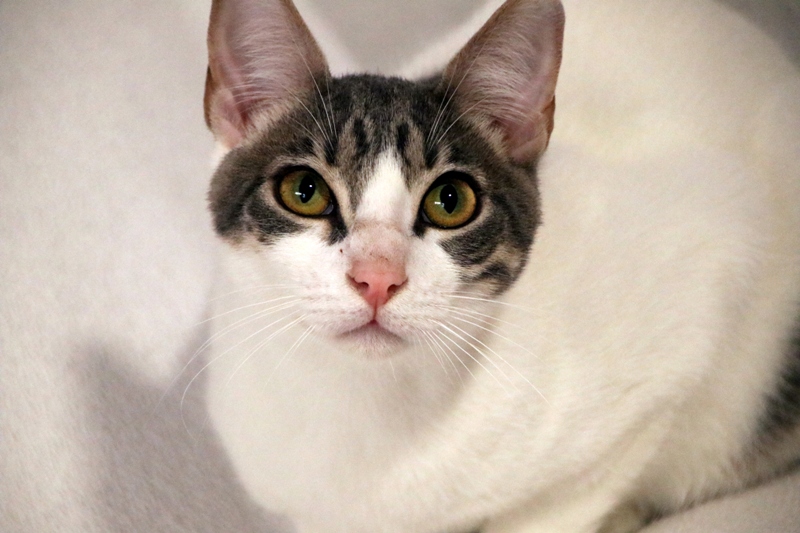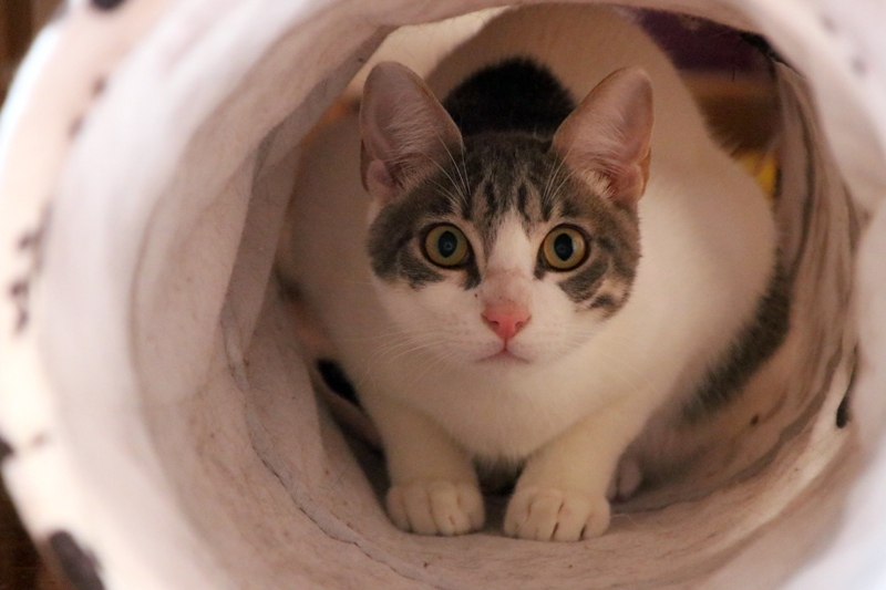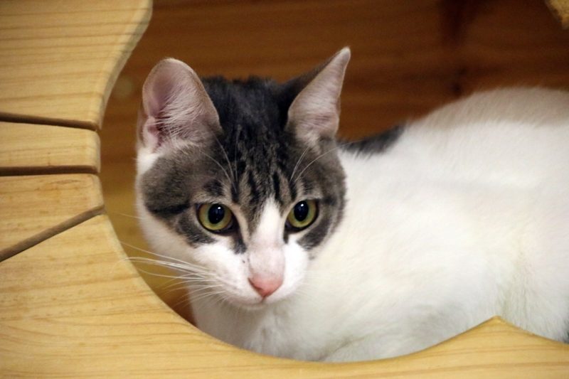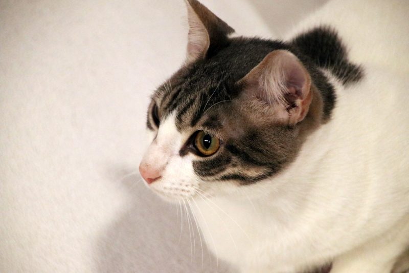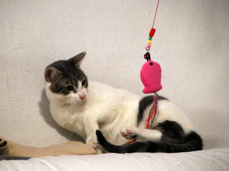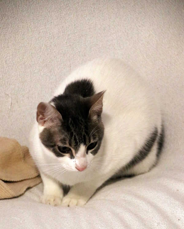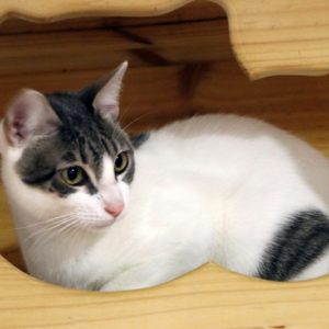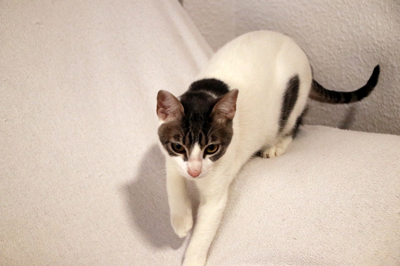 Es un gato muy mimoso, muy dulce, tímido, es juguetón porque es muy jovencito, pero no es nada trasto. Es muy bueno. Como es miedosete y le gusta la calma, es más que apto para un hogar de personas adultas, pero no sería un gato adecuado para un hogar con niños.