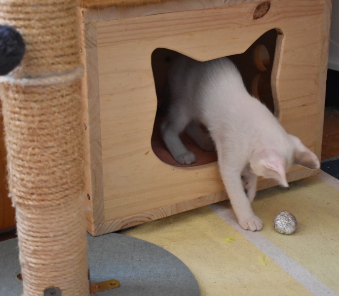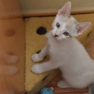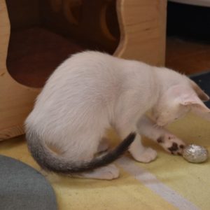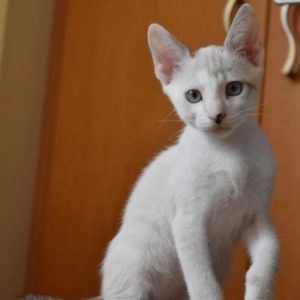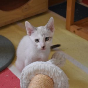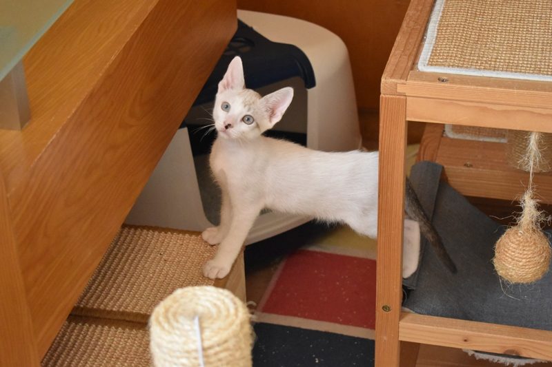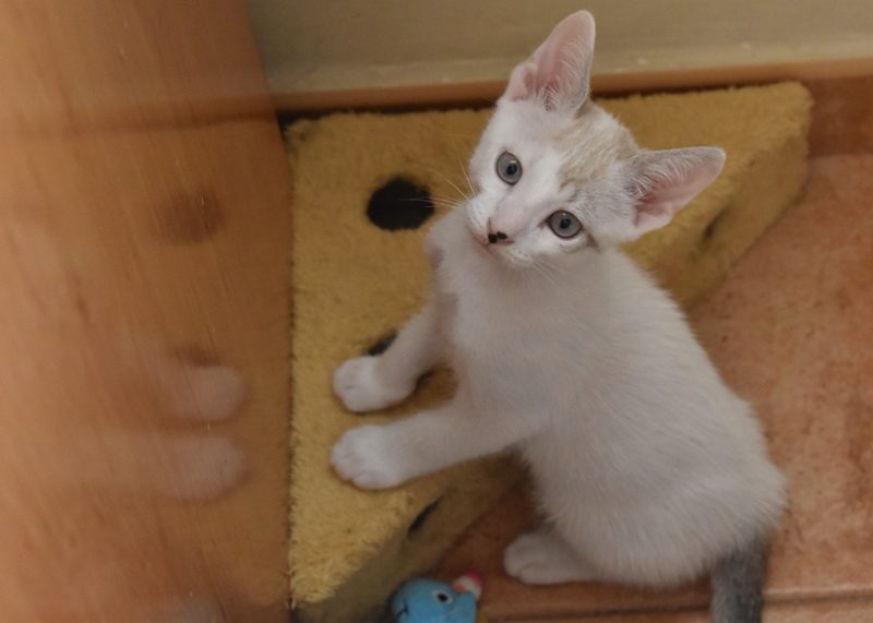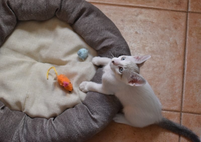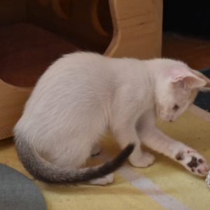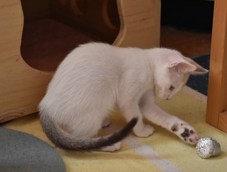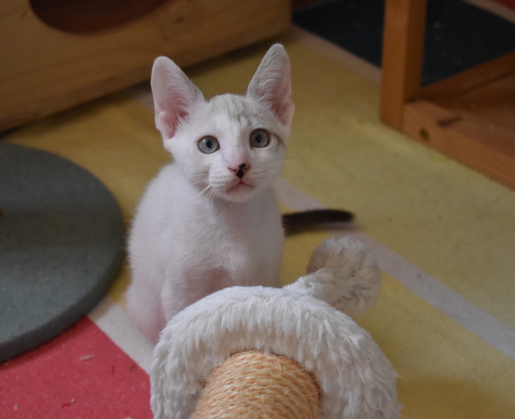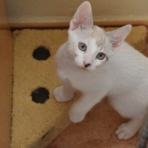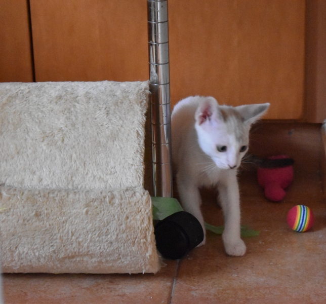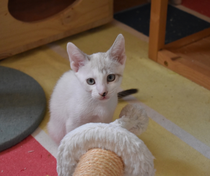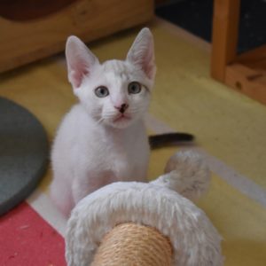 Este pequeñajo cruce de siamés de ojos azules es súper ronroneador, divertido, alegre y confiado. Convive en su casa de acogida con su hermana blanquinegra MATY, y pasan el día correteando, haciendo el trasto, y cuando se cansan duermen uno sobre el otro pegaditos. Son un amor los dos.