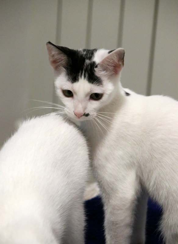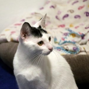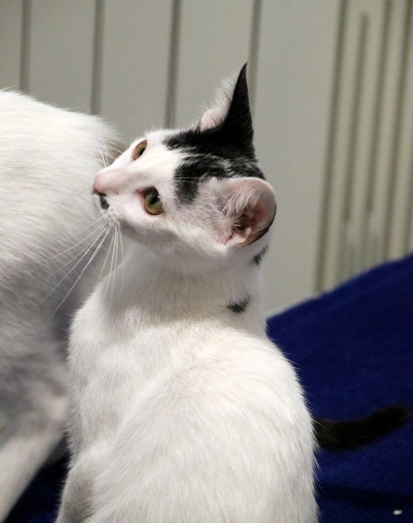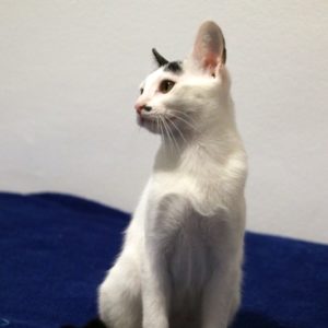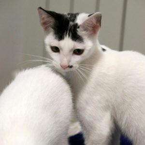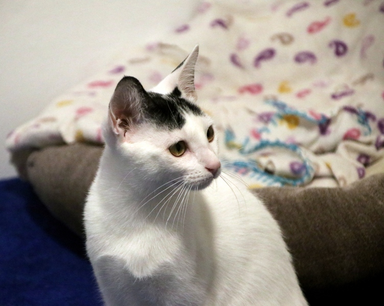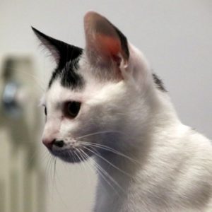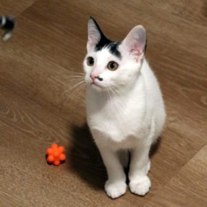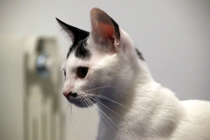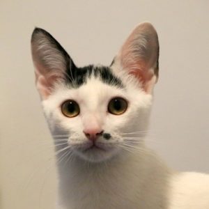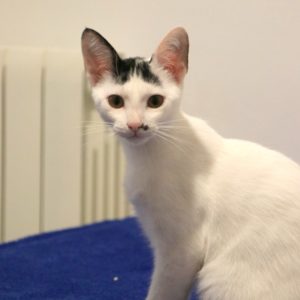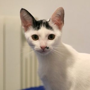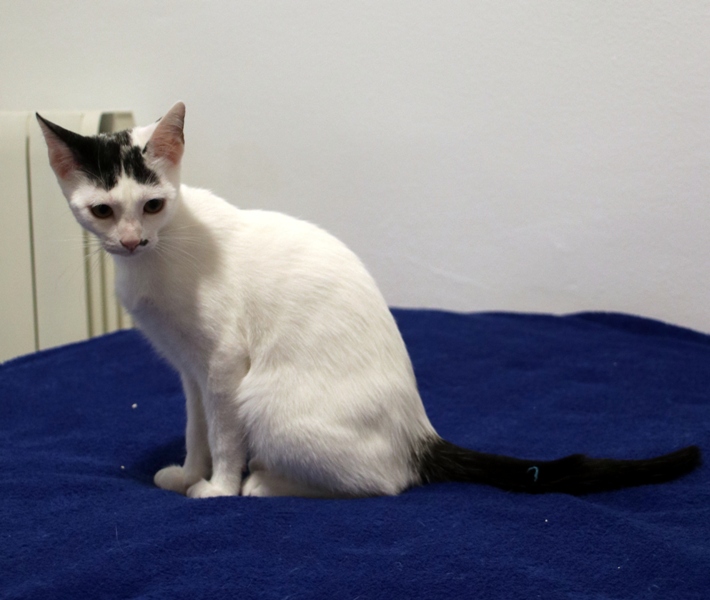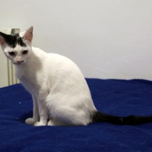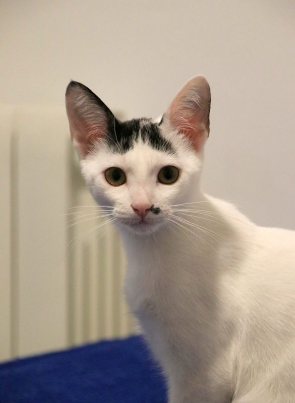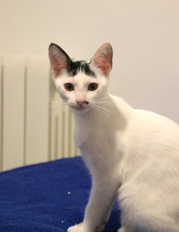Esta chiquitina blanquinegra preciosa de ojitos tristes y preciosas motas en su pelaje, es al principio tímida, y luego es muy cotilla, divertida, y súper dulce. Convive en su casa de acogida con su hermano cruce de siamés MATISSE, y pasan el día correteando, haciendo el trasto, y cuando se cansan duermen uno sobre el otro pegaditos. Son un amor los dos.