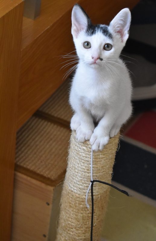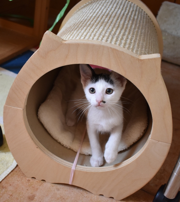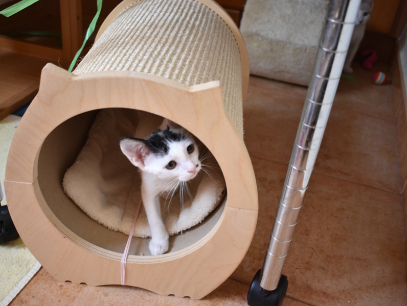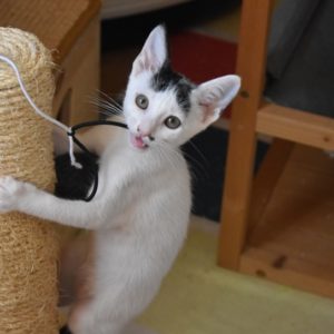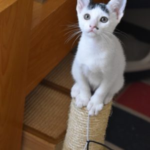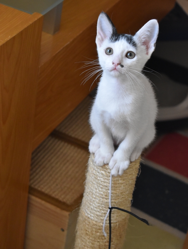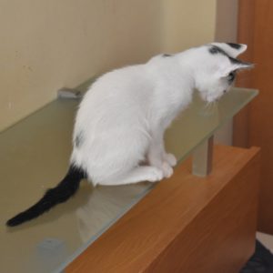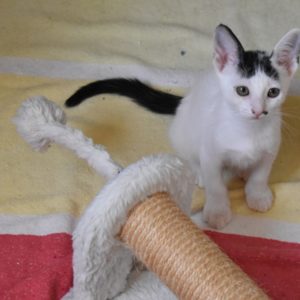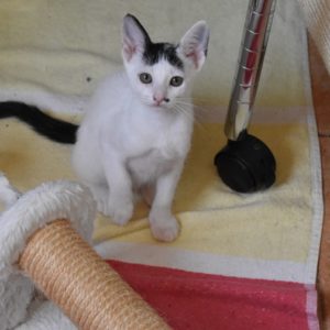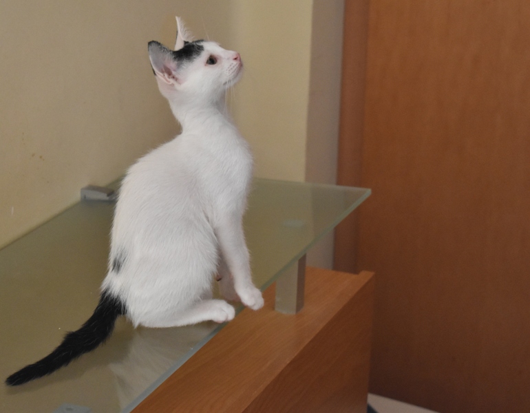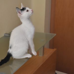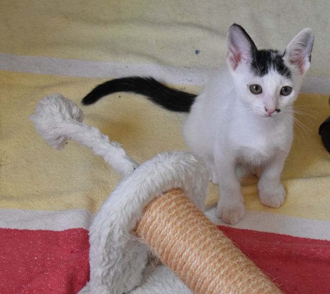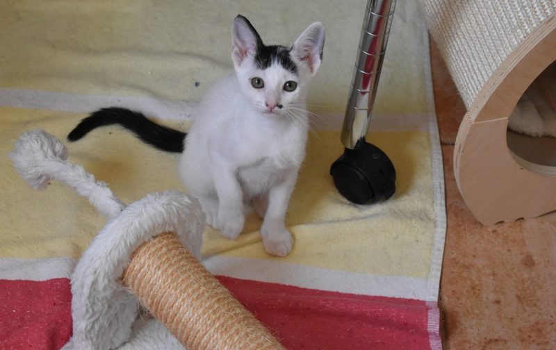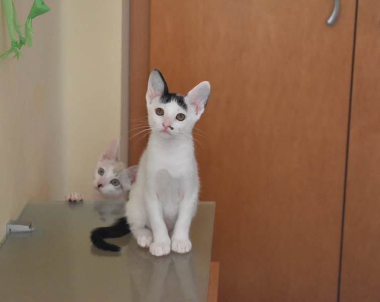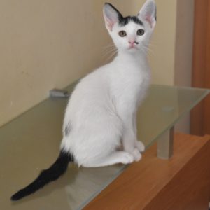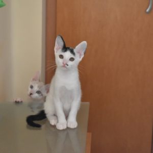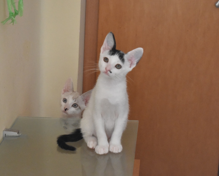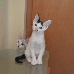 Esta chiquitina blanquinegra preciosa de ojitos tristes y preciosas motas en su pelaje, es al principio tímida, y luego es muy cotilla, divertida, y súper dulce. Convive en su casa de acogida con su hermano cruce de siamés MATISSE, y pasan el día correteando, haciendo el trasto, y cuando se cansan duermen uno sobre el otro pegaditos. Son un amor los dos.