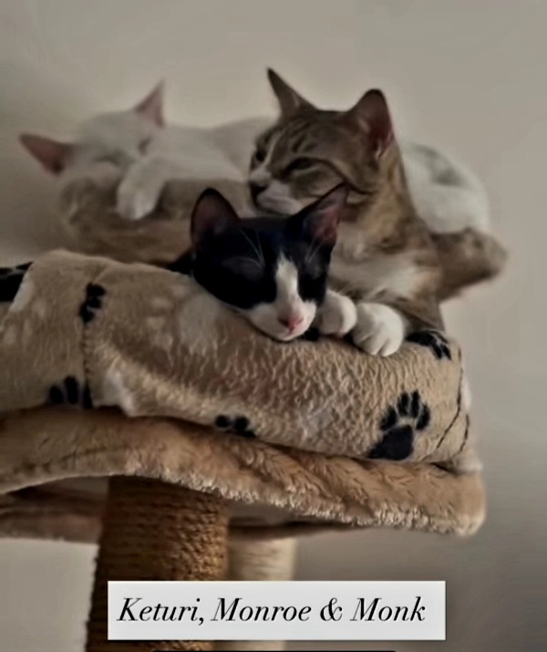 Cuando pasa el tiempo y MONROE ya te conoce, y está en su lugar de seguridad en alto (un rascador de plataformas, un sofá, una cama), y lo tocas, es una máquina de ronroneos, croquetas, topetes con la cabeza, y mimos.