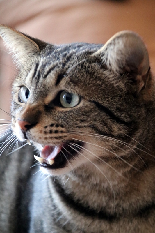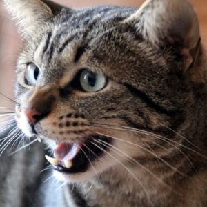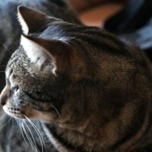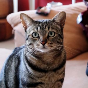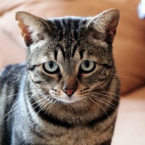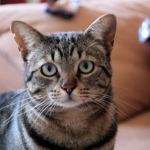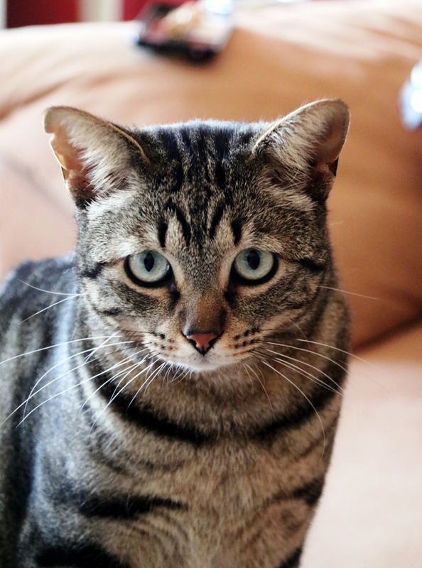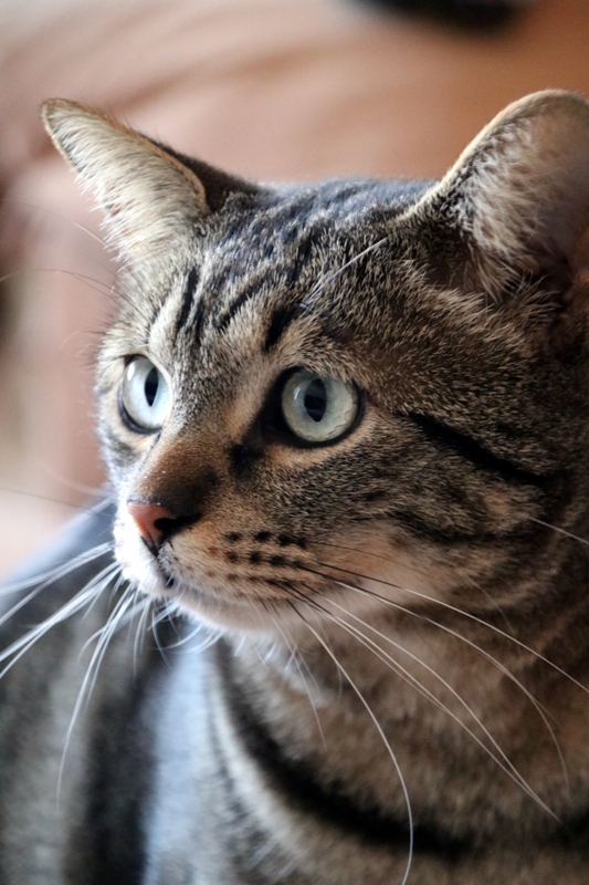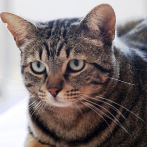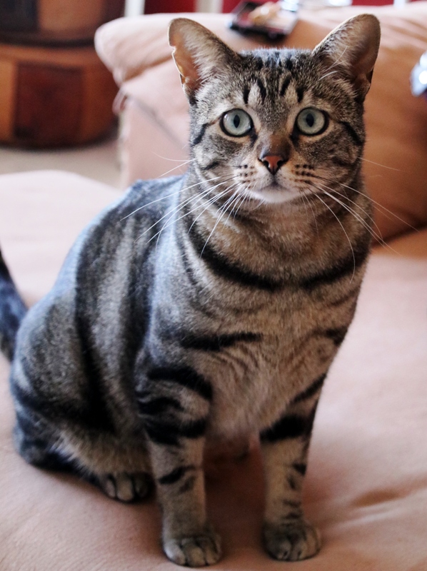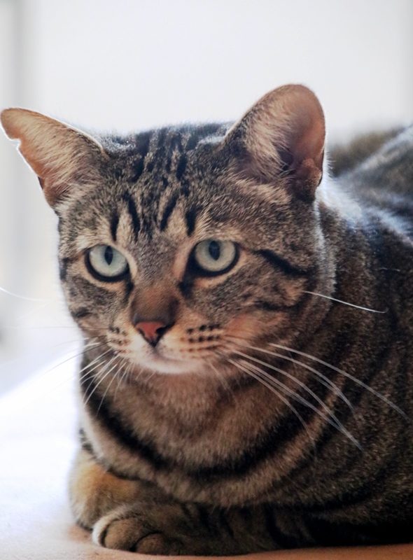 Este preciosísimo gato pardo con dibujo tabby a círculos, de ojazos verde mar, es NOEL. Lo hemos rescatado en Navidad, con un fuerte resfriado, del que se ha recuperado súper bien.