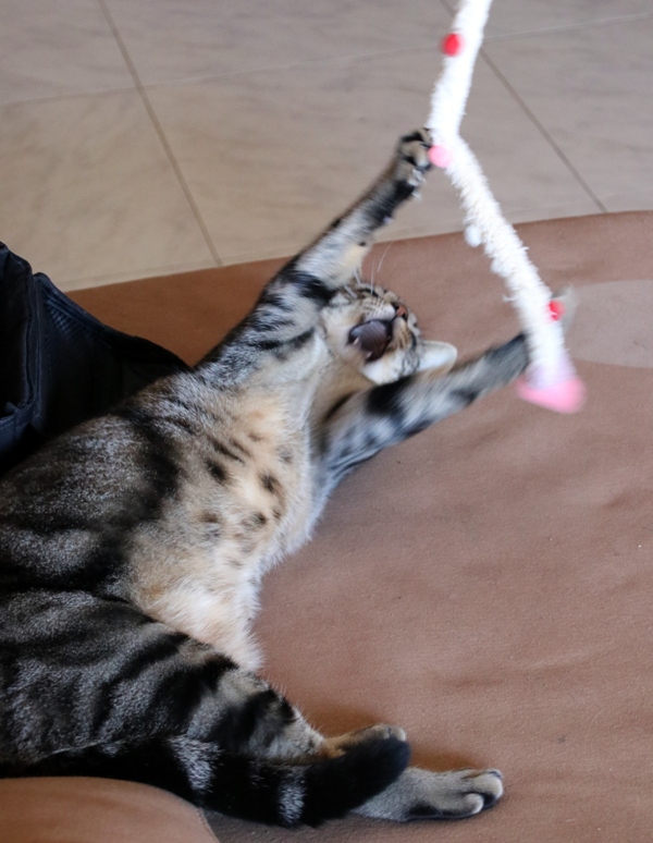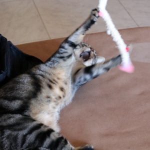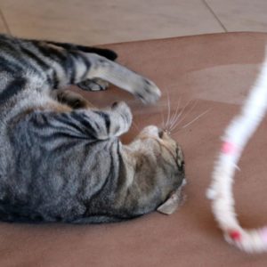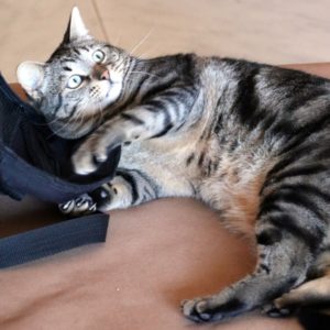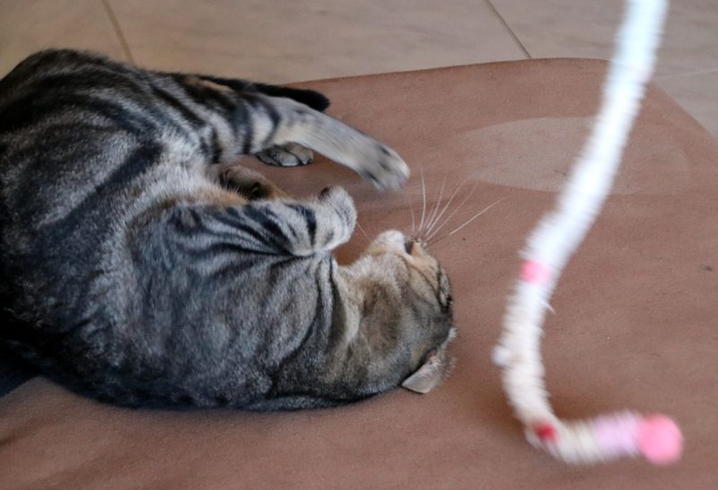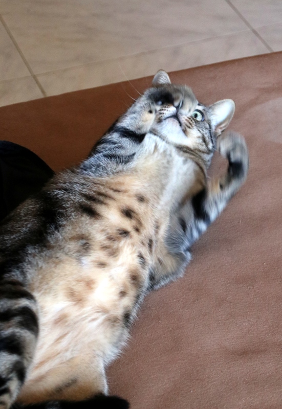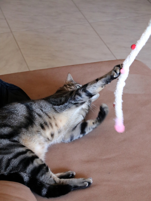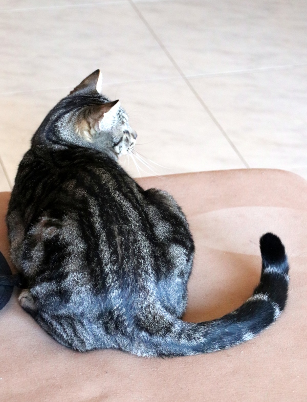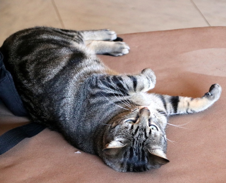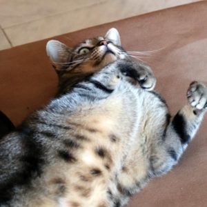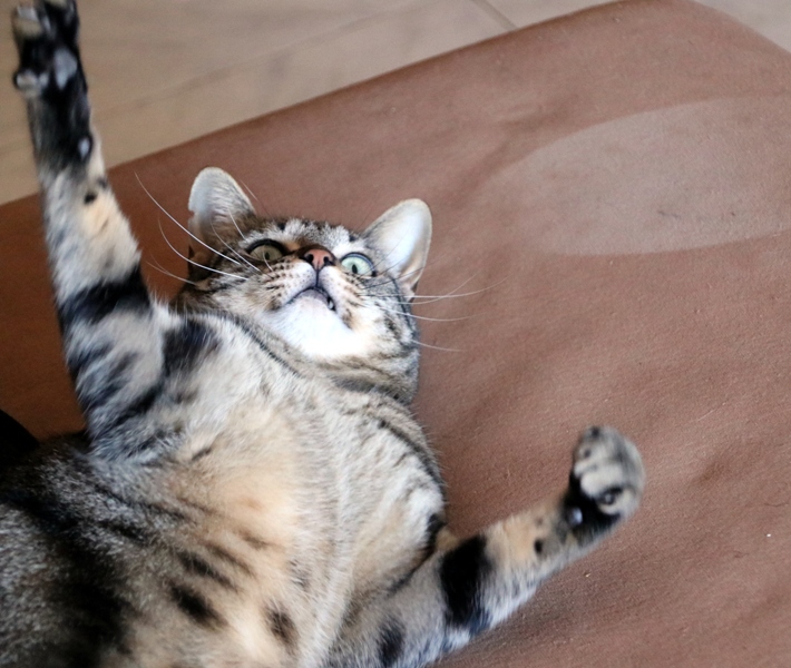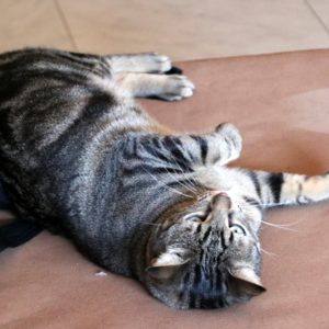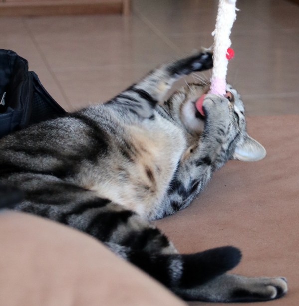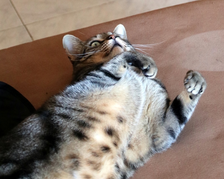 Es un gato muy bueno, cariñoso, juguetón a ratos porque es joven, y muy ronroneador. Especialista en hacerte la croqueta, y ponerse tripa arriba para que le rasques bien, jajajaja…