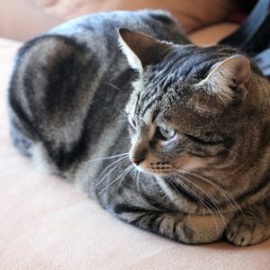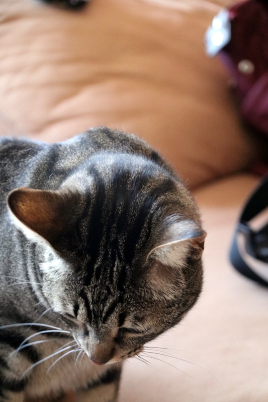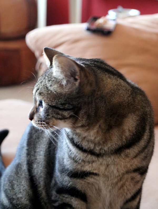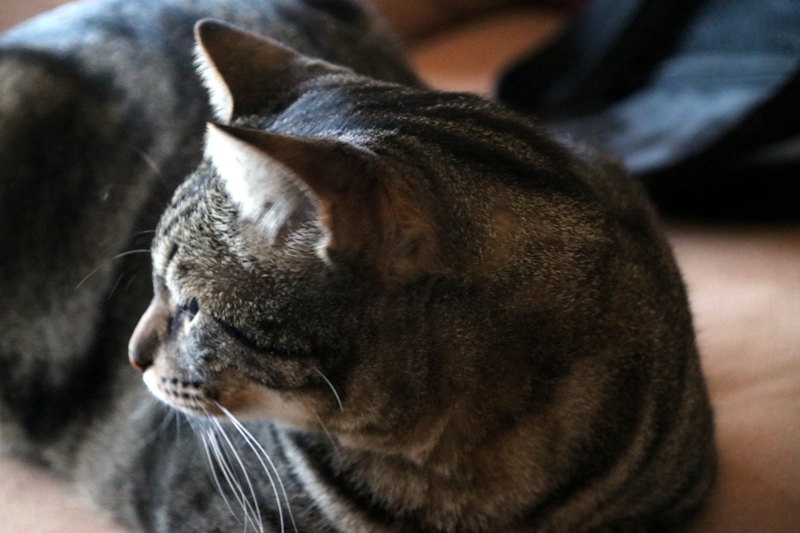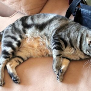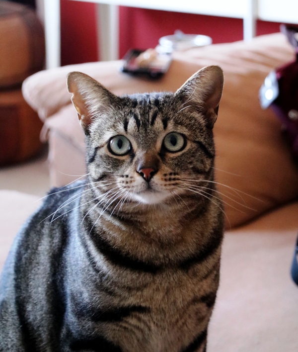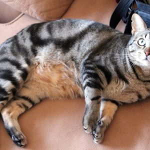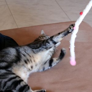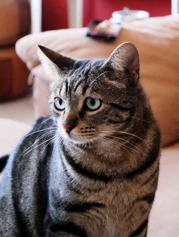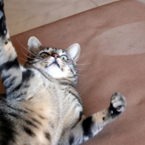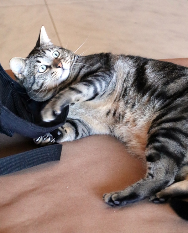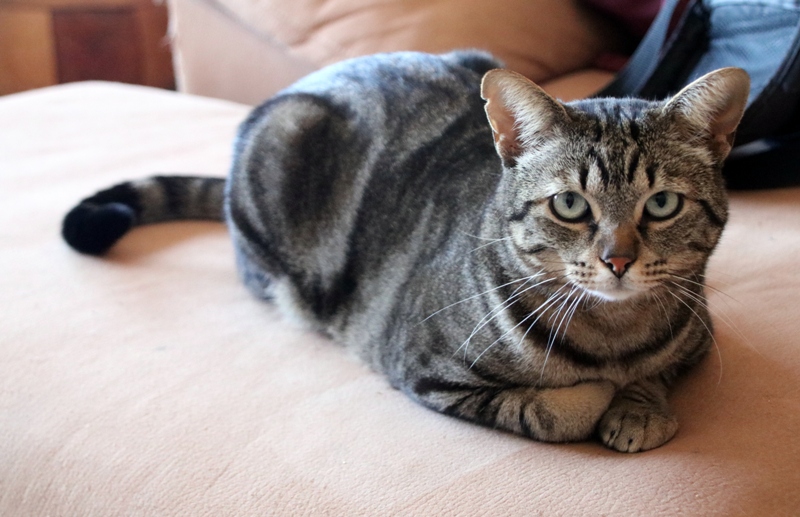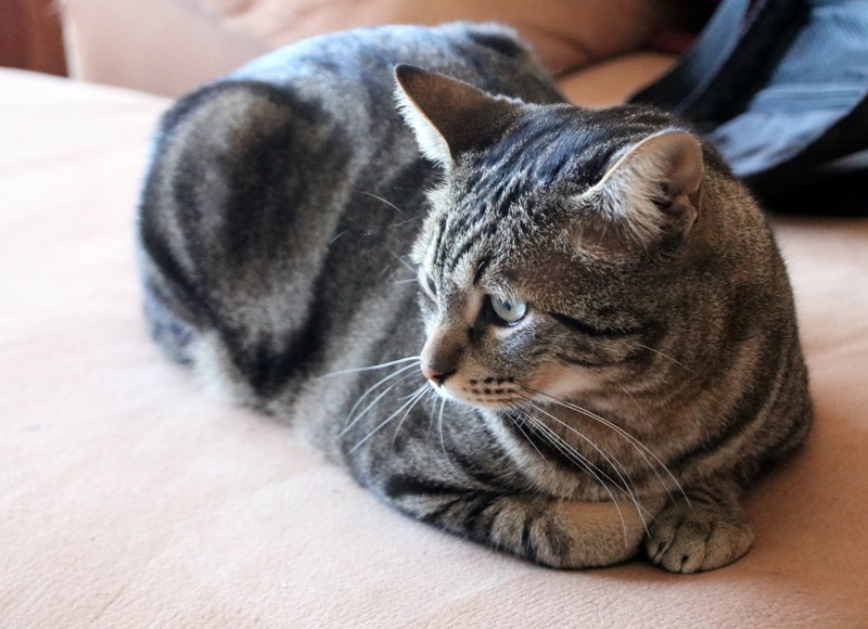 Es un gato muy bueno, cariñoso, juguetón a ratos porque es joven, y muy ronroneador. Especialista en hacerte la croqueta, y ponerse tripa arriba para que le rasques bien, jajajaja…