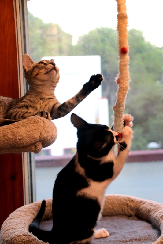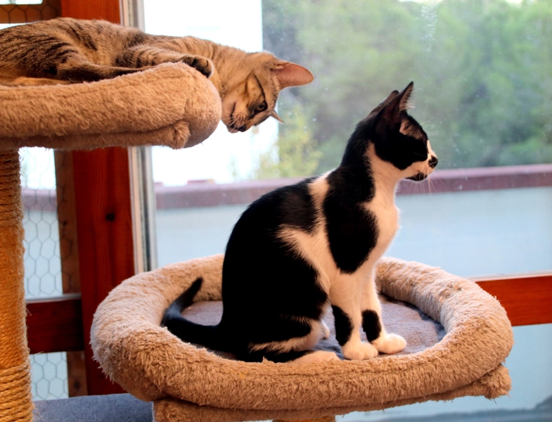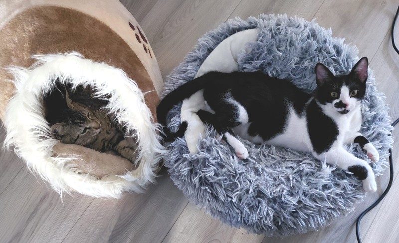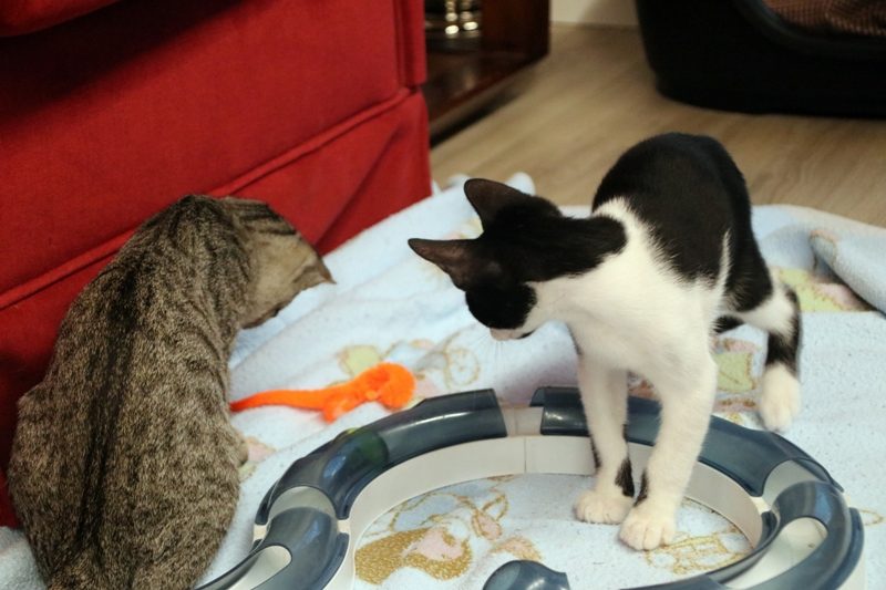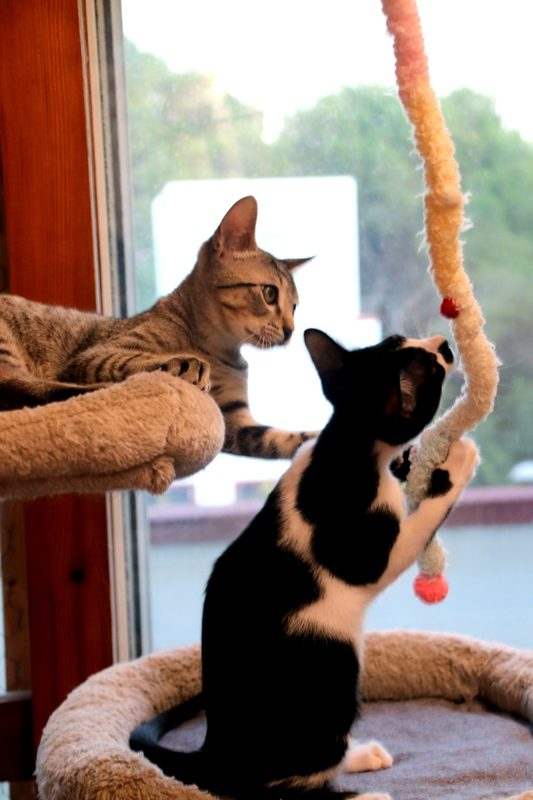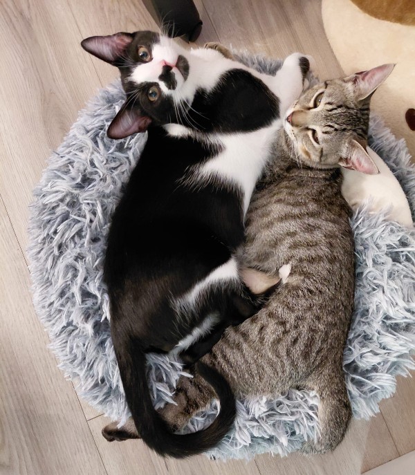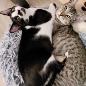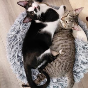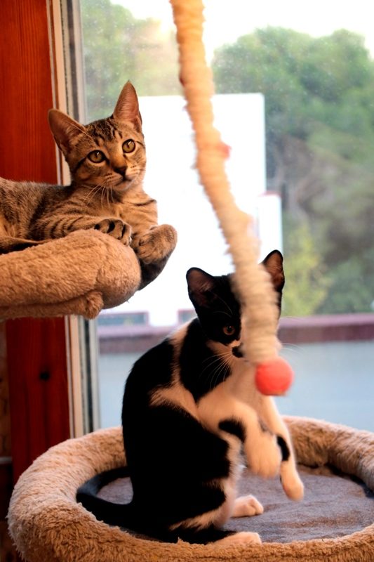 Buscamos para ellos una ADOPCIÓN CONJUNTA, porque se buscan cuando no se ven, se equilibran el uno al otro, y son la única familia felina que los dos han conocido.