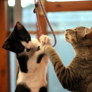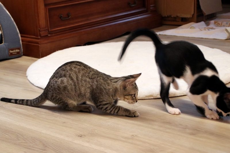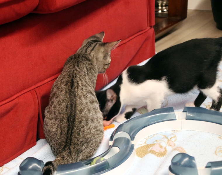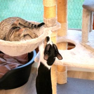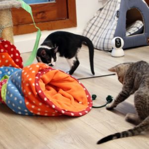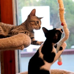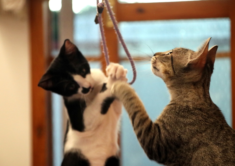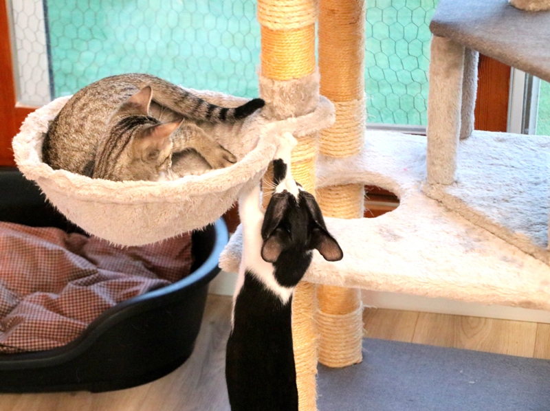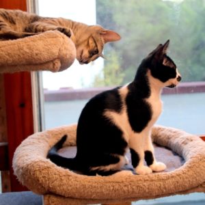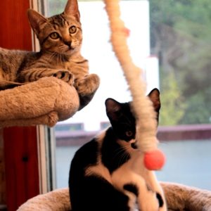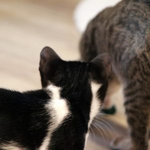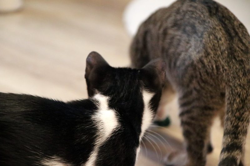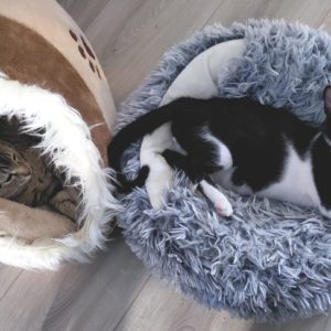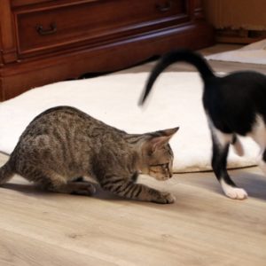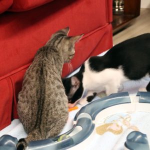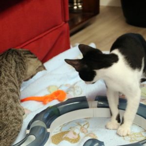 Buscamos para ellos una ADOPCIÓN CONJUNTA, porque se buscan cuando no se ven, se equilibran el uno al otro, y son la única familia felina que los dos han conocido.