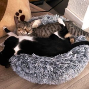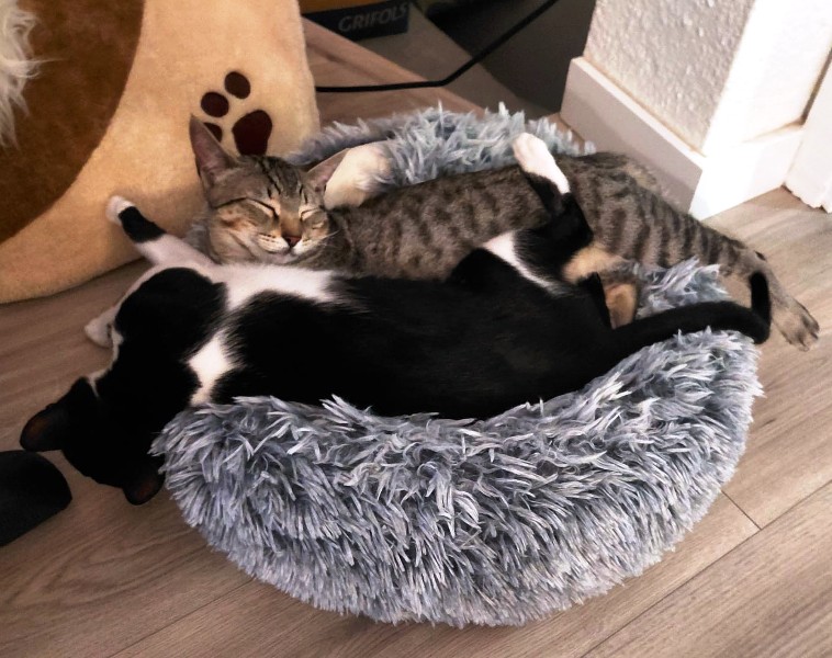 La pegatina mimosona y dependiente de personas es WILLY, el guapetón pardito, y en cuanto puede se te sube encima a pedirte mimos constantes. El pirado divertido con quien no te puedes aburrir es NOVE, con esa carita preciosísima blanquinegra, de manchas únicas. Una pareja guapísima y complementaria.